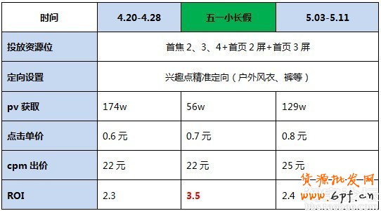 3) 長(zhǎng)假過(guò)后pv、cpm和ROI都穩(wěn)定回升,特別是cpm的上升的一個(gè)不可逆轉(zhuǎn)的趨勢(shì);在4月25日-5月10日這半個(gè)月的“cpm凹槽(紅框內(nèi))”是我們可以好好利用的時(shí)間。