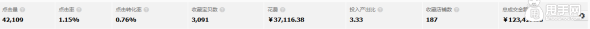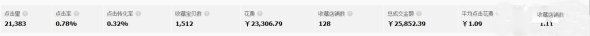 從圖中可看到,1個月的點(diǎn)擊量大概在2萬多,而平均每天點(diǎn)擊量不到1000,PPC在1塊錢左右,也就相當(dāng)于是每天花費(fèi)1K左右,ROI在1.11,點(diǎn)擊轉(zhuǎn)化率為0.32%,收藏成本為15.4元。