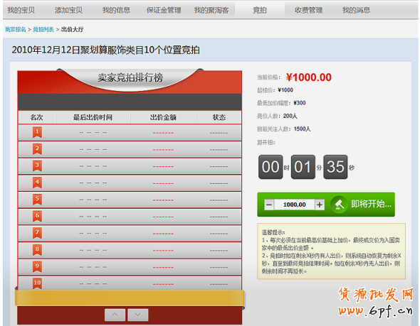 舉例:某款商品終審通過時間為2014年6月1日,商家可參與競拍時間為6月2日—7月1日;6月2日商家可競拍的排期日為6月23日; 如6月2日商家放棄競拍或者流拍后, 6月3日商家可競拍的排期日為6月24日,依此類推,直至競拍成功或超過競拍有效期7月1日。(說明: 上述案例中尚未考慮商家疲勞期控制的因素,在疲勞期控制期間無法參與競拍)。