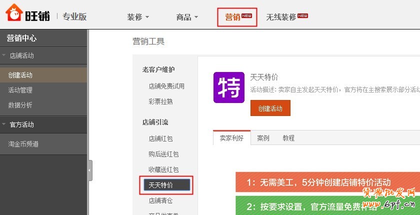 2、進入活動中心后,點擊“天天特價店鋪活動”或“店鋪清倉”即可創建活動。