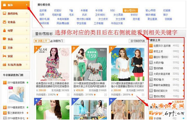 我們在瀏覽器輸入:top.Taobao.com 進(jìn)入后選擇我們對應(yīng)的類目,如“雪紡衫”我們就能挖到一批關(guān)鍵字