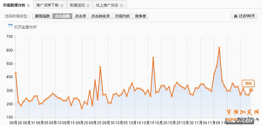 這里主要看行業(yè)走勢。如果上升,那么直通車推廣引流則會容易些,在大環(huán)境推動下,寶貝具有市場推廣潛力。以機(jī)頂盒置物架為例,在行業(yè)搜索指數(shù)下滑的情況下,暫緩選擇推廣。