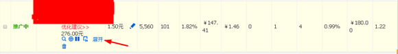 點擊推廣計劃,進(jìn)入點擊推廣寶貝的“展開”,如圖所示可以查看寶貝流量來源,也可以進(jìn)入直通車報表內(nèi)進(jìn)行詳細(xì)的剖析。