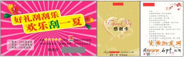 若店鋪產(chǎn)品性價比稍低、質(zhì)量一般,可以采用此方法。通過感情路線,把感謝卡給予買家,通過文字的形式,烘托出買家情感,讓其體諒店鋪成長的不容易(如上圖右一和右二展示)。
