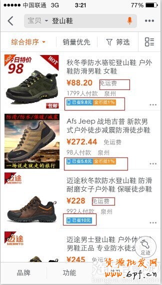 在上圖,“圖三”手機客戶端搜索框中輸入“登山鞋”搜索,就會出現登山鞋的搜索結果,并且會在手機屏幕底部出現“品牌”、“功能”、“鞋碼”,分別是寶貝的品牌詞、功能詞和屬性詞。在設置寶貝標題的時候,也可以選取合適的詞與登山鞋組成長尾詞,做為寶貝標題的組成部分。
