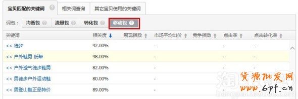 在PC端直通車后臺,添加寶貝推廣后,在系統推薦關鍵詞中“移動包”里,可以選取相關度高的關鍵詞,用來組成無線端寶貝標題。