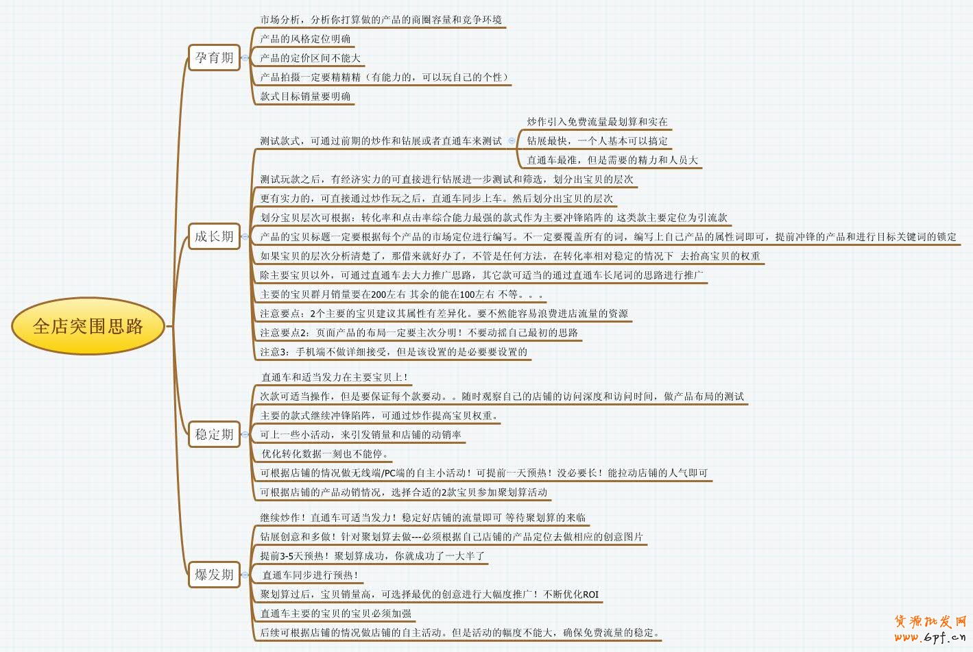 還有就是,你店鋪本身的資源位也是有限的。在店鋪影響力不是很足的基礎上,很難做到每個款都能動得很好。但是,你的店鋪有一個爆款群產生,動個8-12個款都能賣得比較好,這還是可以實現的!好吧,不扯淡了。直接一個思維導圖,理下全店突圍的思路。