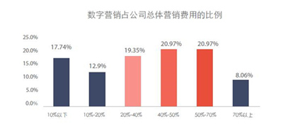 通過調研,我們可以看到,目前品牌對在數字營銷上增加預算的態度分為兩種:激進VS審慎。有24%的品牌表示,數字營銷預算增長了50%以上。部分品牌更以非常激進的姿態增加了自身在數字營銷的預算比例。5%的受訪品牌表示,過去一年里他們用于數字營銷的預算增長了100%,極端例子甚至表示他們在數字營銷預算上的費用增長了10倍。而超過60%的品牌這一增加比例在20%-50%之間,較為穩定審慎。