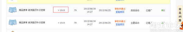 (這個小編是經過考證的,之前小編報名一款牛仔短褲,原價定在是89,實際銷售價格是29.9,第一次報名天天特價定價為19.9沒有通過,后來受邀一個站外秒殺活動一周的時間,價格為16.9,等我回過頭再試著以9.9的價格報名上天天特價,還是沒通過,其實寶貝本身的進價遠就不止9.9元了,卻虧本都沒通過,原因可想而知了,這個問題大家可以分析下,我想大家明白這點,想通過活動就不那么難了)