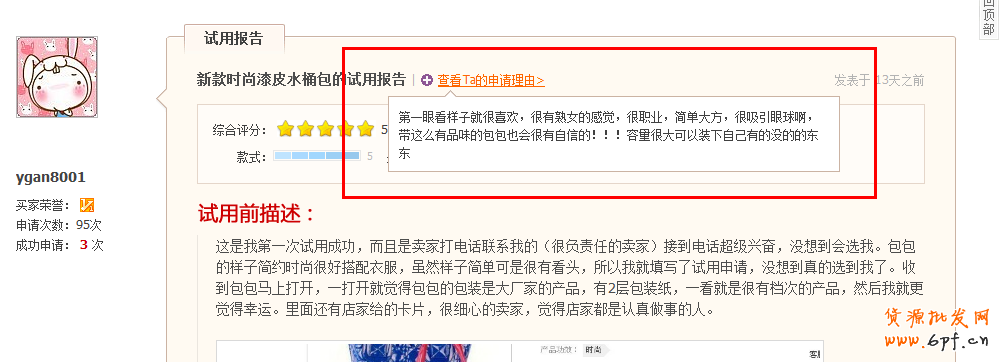 在用戶的試用報告里面,我們同樣會將用戶申請的相關信息提供給會員查看、監督,包括用戶的相關資料以及對應的申請理由: