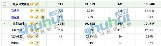 直通車和淘客占到14%左右,直通車展現量高,但是點擊率還是太低。主圖、直通車標題、銷量,三個方面可以同時下功夫,但是同一時間測試的時候注意控制變量。