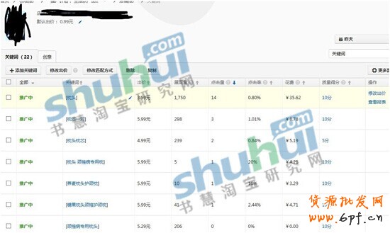 店鋪推廣做的相對還不錯,創意好,質量得分基本都是10分,觀察5月以來大多數直通車的流量都是從店鋪推廣進來的,其中“枕頭”這個詞入店的最多。