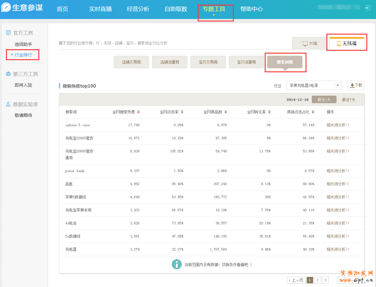 在“生意參謀”中選擇“專題工具”,點擊左側(cè)的行業(yè)排名,然后選擇“無線端”,點擊搜索詞榜。榜單里面的有“全網(wǎng)熱搜”、“全網(wǎng)點擊””、“全網(wǎng)商品數(shù)”、”全網(wǎng)轉(zhuǎn)化率”選項,我們可以根據(jù)選擇需要的關(guān)鍵詞寶貝進行添加。