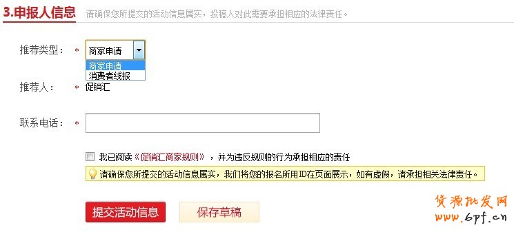 特別提示:以下所有內容填寫請實事求是 ,不得夸大或出現與事實不符的信息,若有不實,【促銷匯】將有權刪除所報名的活動情報, 并把情報發布者的賬號加入黑名單。賬號一旦被加入黑名單,將無法再進行活動推薦。