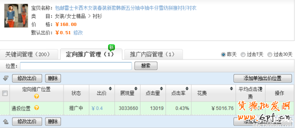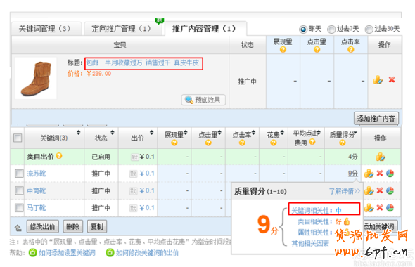 當(dāng)一款寶貝的總體點擊率很高,里面的所有關(guān)鍵詞質(zhì)量得分都很高。我用的方法是利用關(guān)鍵詞的點擊率,提升定向的質(zhì)量得分。下面看圖: