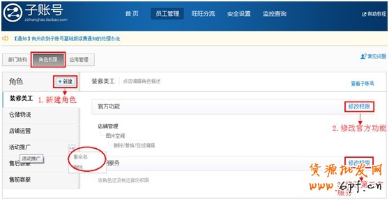 如圖6,根據(jù)店鋪里所有員工的工作職能,設(shè)置相應(yīng)的角色,比如客服、運(yùn)營、美工、倉儲等,并給角色授予不同的權(quán)限。