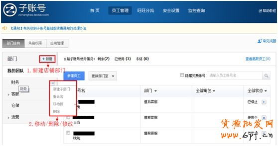 如圖5,按照店鋪的部門結(jié)構(gòu),在子賬號后臺菜單員工管理>部門結(jié)構(gòu)中新建相應(yīng)的部門,例如客服部、財(cái)務(wù)部、運(yùn)營部等。