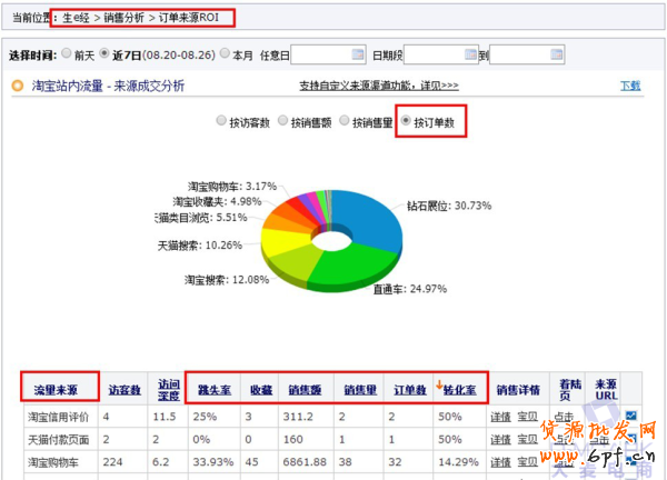 例如,我們常會用生意經進行店鋪訂單來源ROI分析:從下圖,我們可以清晰地看到店鋪淘寶站內流量來源成交分析中,鉆石展位、淘寶/天貓直通車成交占比最大,而淘寶信用評價、天貓付款頁面、淘寶購物車的轉化率較高,因此,我們可以進一步加大這些流量渠道的推廣比例。