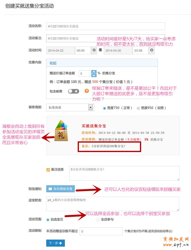我們還可以根據(jù)自己的需要設(shè)置滿金額送、滿數(shù)量送、好評(píng)送!給買家形成一個(gè)循環(huán)拿集分寶的鏈條。