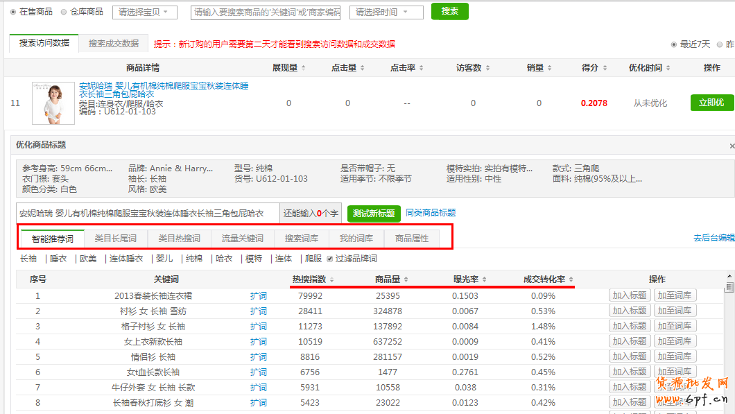 ① 自然搜索流量偏低;② 直通車優(yōu)化不好推廣不夠;③ 商品的類目屬性不夠完整;