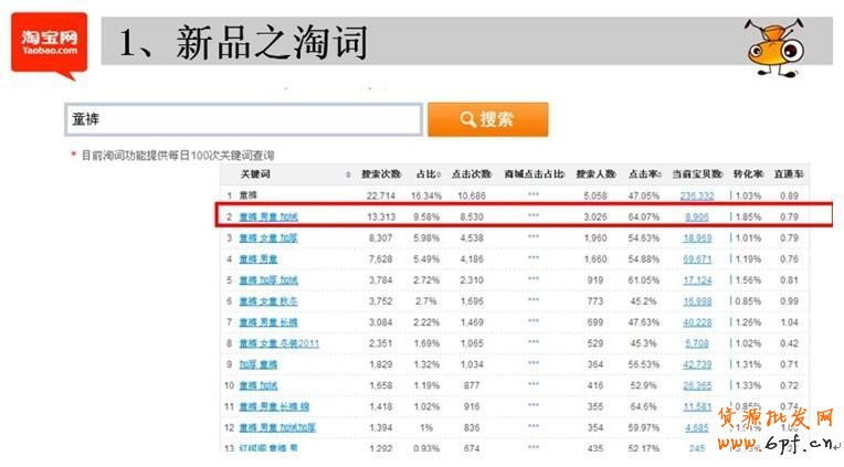 淘詞。數(shù)據(jù)魔方最簡(jiǎn)單的功能就是看淘詞,比如大家在數(shù)據(jù)魔方的淘詞里輸入了童褲,會(huì)出現(xiàn)這么多的熱搜詞,并且還有很多的指標(biāo)值,到底選擇哪個(gè)詞呢?大家看到的這個(gè)是按照搜索量排名,“童褲 男童 加絨”搜索量排第二名,但是在線商品在所有的熱搜詞中卻是比較少的,搜索量大說(shuō)明買家需求大,在線商品少說(shuō)明寶貝的曝光率高,這個(gè)詞條的點(diǎn)擊率和轉(zhuǎn)化率也都比較高,這樣的詞就是我們所要找的。