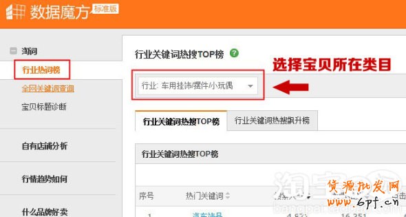 1.打開數據魔方。(訂購半年送淘詞),查看行業熱詞榜,選擇你要優化的寶貝所屬的類目。