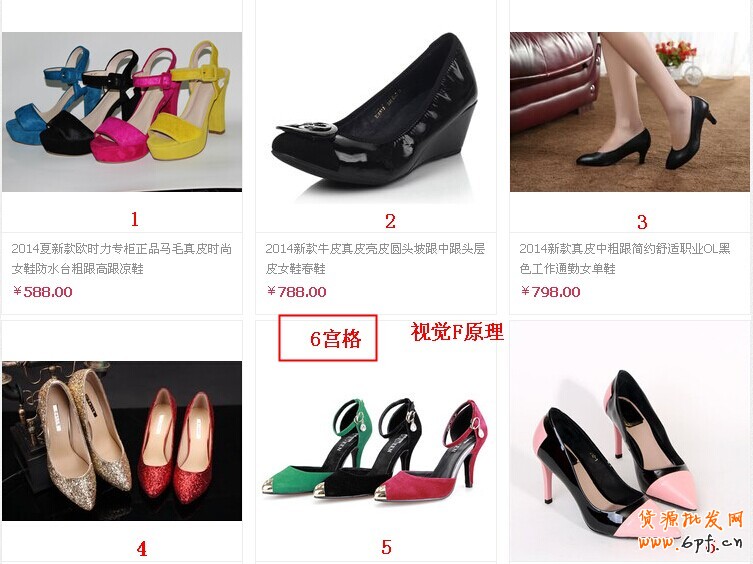 那么首頁 ”寶貝6宮格“和”9宮格“的”視覺F原理“排版寶貝 如何排版呢? 下面是一個六宮格的寶貝排版
