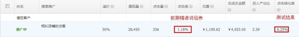 直通車潛在客戶最終溢價:50%左右,溢價降低,點擊率穩定,展現量提高,點擊量提高,并且轉化效果穩定。