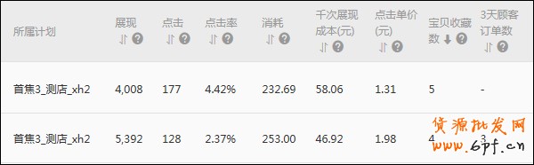 以下為測試店鋪那三天的數(shù)據(jù),只截取部分店鋪的數(shù)據(jù),點擊率高的基本可以算是和我們比較接近的店鋪了,測試的這批店鋪中,點擊率低的只有0.7%不到,高的有4%多。至于為什么下圖中的第五個店鋪點擊率不高,卻消耗了最多預(yù)算,請接著看: