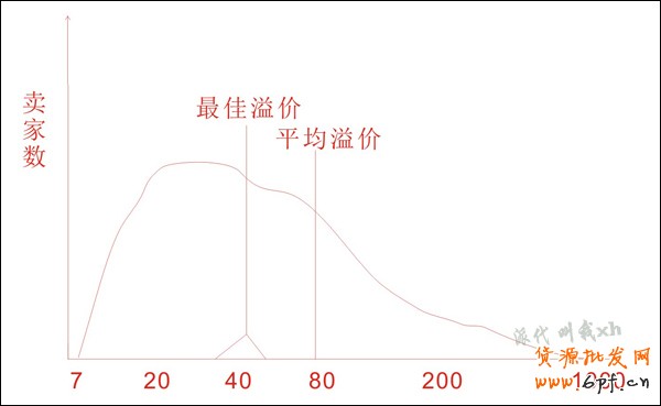 理解了平均溢價,那最佳溢價是什么呢,我這樣來解釋吧:前面已分析了出價在平均溢價以下的賣家遠比高出平均溢價的賣家多,比如出價在78元以下的有100個,預(yù)算300元,出價78元以上的只有3個,但他們的預(yù)算是10000元,根據(jù)之前貼子我們知道,