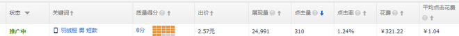剛開始進行寶貝推廣時,競爭大、流量大的熱詞并不適合我們,精準的匹配度高的關鍵詞才是我們最需要的。投放精準的關鍵詞可以快速提高質量得分,質量得分一旦上去那么出價排名就會跟上。所以,我們可以圍繞幾個中心詞來做。有的寶貝一個計劃一個中心詞帶來的延伸詞就夠用的了。