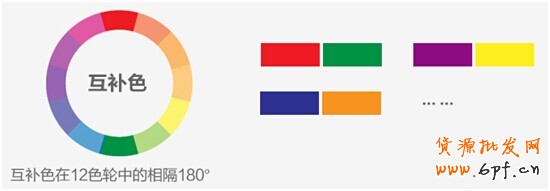在色輪中相隔180的2個(gè)顏色互為補(bǔ)色,它是色彩搭配中,對(duì)比最為強(qiáng)烈的顏色。互補(bǔ)色就是中間間隔2個(gè)顏色,紅+綠,橙+藍(lán),黃+紫…