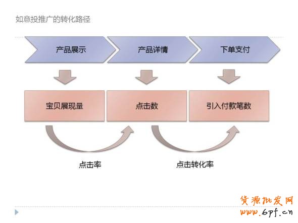 1.首先我們看下如意投的轉化路徑   如意投的轉化包含三個節點,產品展示(曝光)、產品詳情(跳轉到店鋪的寶貝頁面)、下單支付。這些數據在如意投報表中都有統計,產品展示對應寶貝展現量(流量),賣家點擊(點擊數)后到達寶貝詳情頁面,點擊購買進入購買支付流程。如圖: