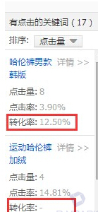 例 如“運動哈倫褲 加絨”的點擊單價從0.1變0.14,再到0.2;“哈倫褲男款韓版”點擊單價從0.55變0.42,因為這段時間“運動哈倫褲 加絨”的點擊量增多且沒轉化,它的PPC會逐漸增加到出價,而“哈倫褲男款韓版”單價在降低,因為它在這期間轉化了一筆,從下面的轉化率即可知道。