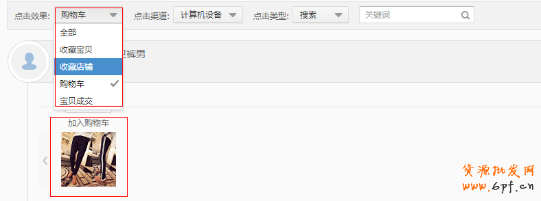 在[點擊效果]的[購物車]可看出,買家點擊此寶貝,卻把其他寶貝加入購物車。如果查看此情況很多買家都這樣的話,那我們這寶貝需優化。同時這也可判斷店鋪的關聯是否有用。