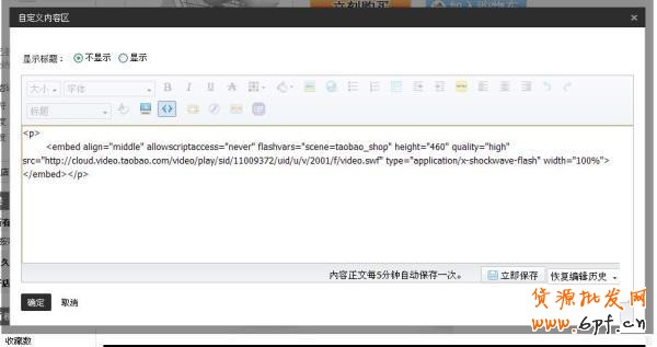然后打開新建的寶貝描述頁面,選擇在默認(rèn)模板下新建自定義模塊,將剛才的淘寶視頻分享的html代碼進(jìn)行復(fù)制,并且修改其中的參數(shù),如圖