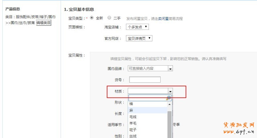 請您在商品發布時根據商品的實際材質和材質含量選擇相應的屬性,并保證商品類頁面各區塊中(如商品標題、圖片、屬性、詳情描述等)材質屬性的一致性,具體材質屬性要求請您查看《淘寶網商品材質標準》。