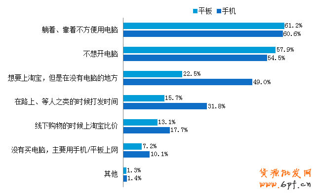 同樣作為無線設備,手機充分體現了移動的特性。從用戶常用的時間和場所來看,淘寶用戶使用手機上網的場景更為豐富;而平板電腦受到體積、重量以及網絡的限制,用戶的使用場景則非常的固定和單一,某種程度上平板只是取代了PC的作用。