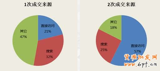 例如,我們在分析成交用戶1次與2次以上來源渠道區(qū)別時發(fā)現(xiàn),雖然兩次以上用戶更容易通過自己的收藏、買家中心等方式進入店鋪;但是依然還是會有接近四分之一的人通過搜索進店,它與1次用戶的搜索來源占比差別并不大,這也是上面提到的教育消費者通過更方便易記的搜索方式二次進店的數(shù)據(jù)依據(jù)。