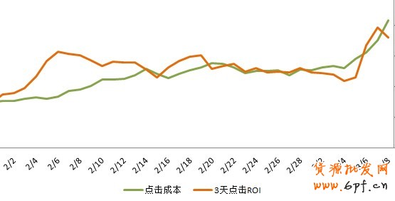 從以上趨勢圖可以看到,隨著春節(jié)后消費者的回歸,鉆展流量有較大幅度的提升,競價成本、點擊成本呈慢慢上升趨勢,散上升的幅度其實不是特別大,到38女人節(jié)到達第一個小高點。相應的3天點擊回報率在春節(jié)后第一周有一個小波峰,在第2周持續(xù)保持較高的水平。