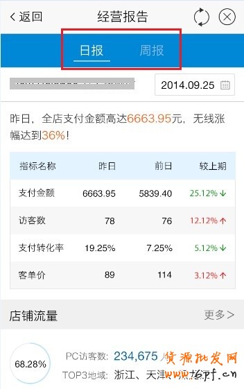 在分析-經營報告里將會有日報和周報,你可以對店鋪的經營狀況進行分析,包括重點指標的解讀,店鋪流量來源(包含PC端和無線端)和支付金額top商品的詳細分析。你可以更全面地看數據,也更好地了解店鋪經營狀況。