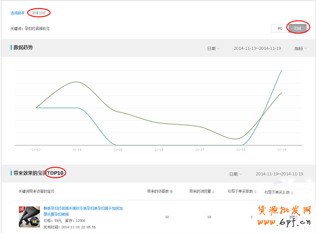 說到這里,可能有些賣家會覺得:這里看的是全店的無線端搜索關鍵詞,我怎么知道更加適合哪個寶貝呢?這個也不用太擔心,可以點擊關鍵詞后面的“詳情分析”,進去后就可看到相應的關鍵詞最近7天所帶來的訪客數和下單買家數,同時還可查看到帶來效果的top10寶貝,通過這里,就可以判斷該關鍵詞更加適合哪個寶貝了,只要充分利用好這些詞,就能夠為店鋪帶來意想不到的驚喜哦。