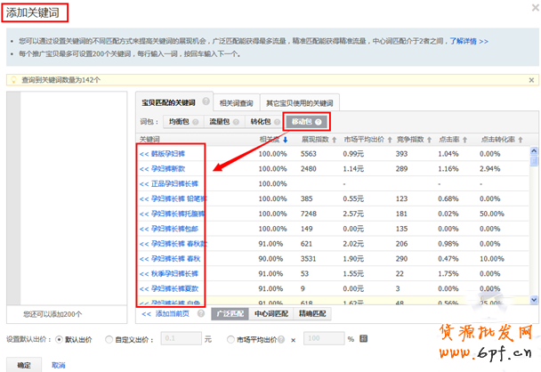 在淘寶/天貓直通車后臺,在寶貝關鍵詞管理界面,點擊添加關鍵詞,在寶貝匹配的關鍵詞一欄,我們會看到四個關鍵詞包,分別是:均衡包、流量包、轉化包和移動包。而移動報會提高與寶貝匹配且具有在移動端展現機會的關鍵詞,這部分關鍵詞就是我們要找的具有無線展現資格的關鍵詞。