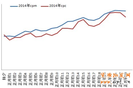 2)下圖為2014年和2014年春節(jié)期間無線app焦點(diǎn)圖的引流成本趨勢(shì)