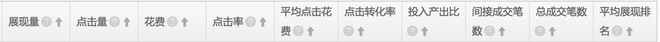 點擊數(shù)據(jù)包括:展現(xiàn)量、點擊量、花費、點擊率、平均點擊花費、千次展現(xiàn)花費、平均展現(xiàn)排名。