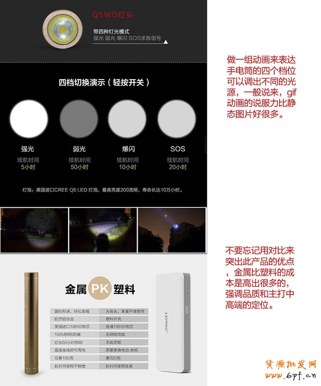 將燈的實用性產經羅列出來,讓顧客對號入座,原來還可以用在這么多的地方,提醒顧客這是一款十分實用的裝備,產品好看外觀看上去又炫又酷,吸引很多年輕女性朋友和特殊工作者購買。