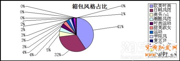 箱包風格是對于掌柜選款相對比較有參考價值的一個數據,很多賣家想要去打造爆款,但是如果本身產品的受眾不多的話,是很難形成爆款的。在箱包類目中,歐美時尚風格的箱包是占比最大的,其次是日韓風格的。