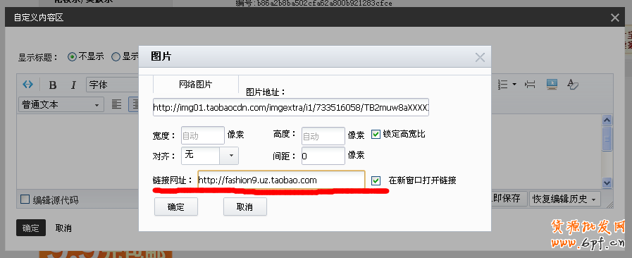 在鏈接的部分我們填入時尚九塊郵的官方網(wǎng)址:http://fashion9.uz.taobao.com,然后點(diǎn)擊確定