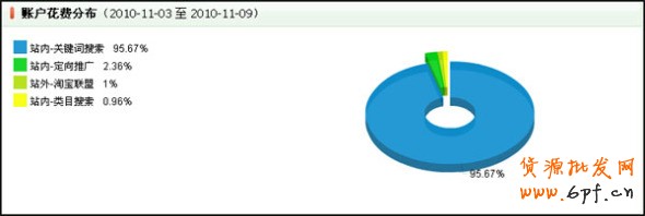 在“賬戶平臺花費分布”中,您可以查看所選時段的總花費分別在“站內-關鍵詞搜索、站內-定向推廣、站內-類目搜索、站外-淘寶聯盟”的分布。