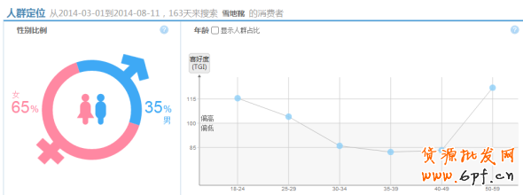 雪地靴在3-6月是他的銷售淡季,搜索指數平均低于2000??梢钥闯鲈擃惸坑泻艽蟮募竟澬?。所以在整個類目搜索指數最低的時候,店鋪通過什么渠道去引流,通過什么方式提高轉化,就成為最關心的問題了。再來看下雪地靴的人群的定位。